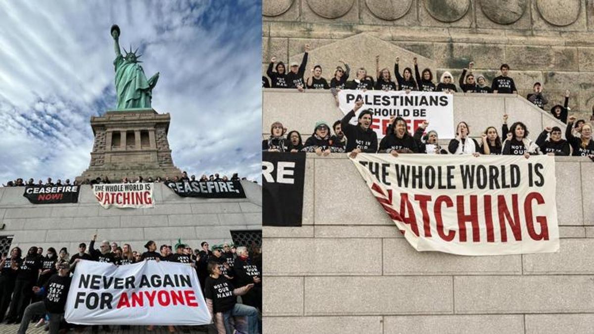 Barış için Musevilerin Sesi (JVP) isimli kümenin davetiyle toplanan yaklaşık 500 kişi, Özgürlük Heykeli önünde pankart açıp oturma hareketi yaptı. Gazze’de ateşkes yapılmasını isteyen aksiyoncular, “Bütün dünya izliyor”, “Filistinliler Özgür Olmalı” ve “Bir Daha Hiç Kimse İçin Asla” yazılı pankartlar açtı.