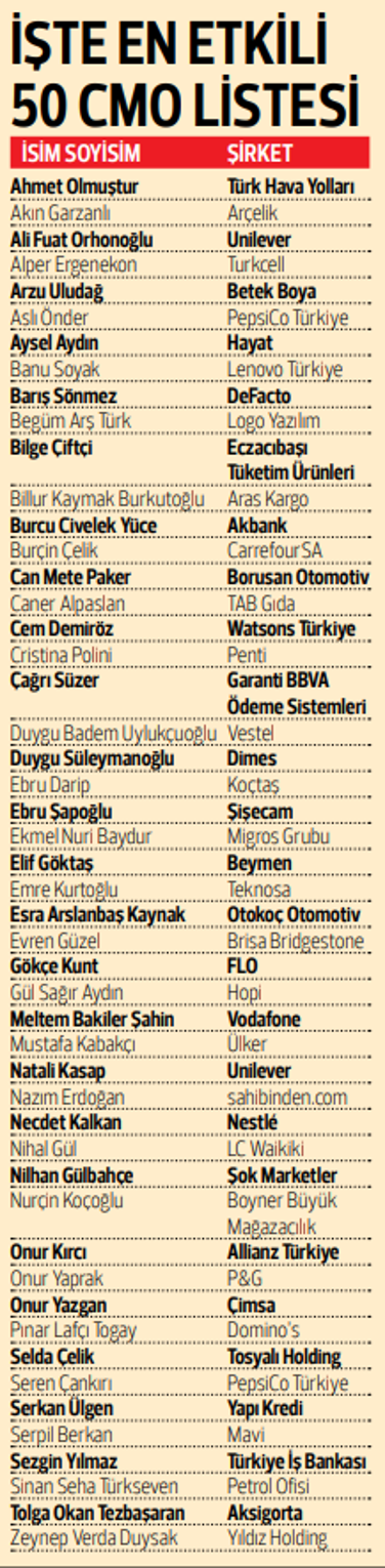“Liste, pazarlamanın trendlerini belirleyenleri görünür kılıyor. Münasebetiyle bu araştırma pazarlama kesimi ve şirketlerin istikametini göstermesi açısından kıymetli. Bir başka kıymetli nokta ise listenin yarısından fazlasını bayan başkanların oluşturması. Bu her geçen yıl artan bir grafikte seyrediyor. Geçen yıl listede 23 bayan önder yer alırken bu yıl sayı 27’ye yükseldi. Bu değişim pazarlamadaki dinamikleri de değiştiriyor. Başarılı önderler, genç bayan yöneticilere örnek oluyor. Ülkemizde pazarlamanın parlak geleceği için umutluyuz ve bu önderlerin yol göstericiliğini takdir ediyoruz.”