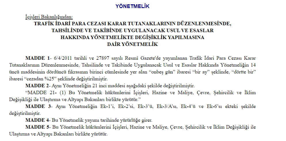 “6/4/2011 tarihli ve 27897 sayılı Resmî Gazete’de yayımlanan Trafik İdari Para Cezası Karar Tutanaklarının Düzenlenmesinde, Tahsilinde ve Takibinde Uygulanacak Metot ve Asıllar Hakkında Yönetmeliğin 14 üncü unsurunun dördüncü fıkrasının birinci cümlesinde yer alan “onbeş gün” ibaresi “bir ay” halinde, “dörtte bir” ibaresi “cezadan %25” formunda değiştirilmiştir.”