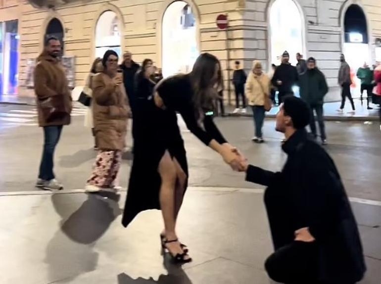 Sevgilisini romantik bir sürpriz için Roma’ya götüren genç adam, toplumsal medyada kısa müddette viral hale gelen görüntüde kız arkadaşı ile birlikte ünlü Via dei Condotti caddesindeki ışıklar altında dans ederken görülüyor.