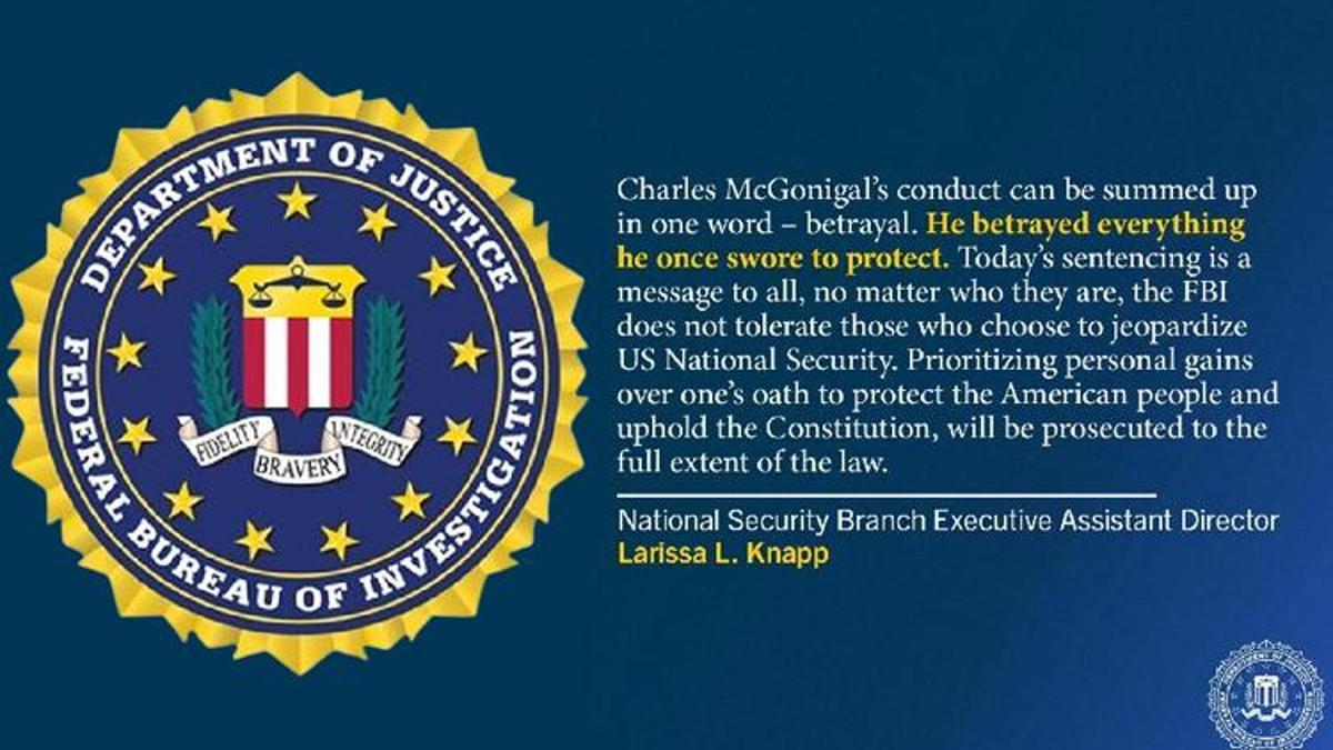 Açıklamada, McGonigal’ın 2018’de emekliye ayrıldığı ama 2021’e kadar Rus Oligark Oleg Deripaska’ya ABD yaptırımları hakkında bilgi vermeye devam ettiği belirtildi. New York ABD Başsavcısı Damian Williams’ın bahisle ilgili açıklamasında, “Charles McGonigal, FBI’daki üst seviye konumunu iş dünyasındaki geleceğine hazırlanmak için kullanarak ülkesinin kendisine duyduğu inancı ihlal etti. Kamu hizmetinden ayrıldıktan sonra Vladimir Putin’in casusu olarak misyon yapan Rus iş adamı Oleg Deripaska’ya hizmet vererek ulusal güvenliğimizi tehlikeye attı. Bugünkü ceza, ABD yaptırımlarını ihlal eden herkesin, bilhassa de bu ülkenin güvendiği şahısların, ağır bir ceza ödeyeceğinin bir hatırlatıcısıdır” sözleri yer aldı.