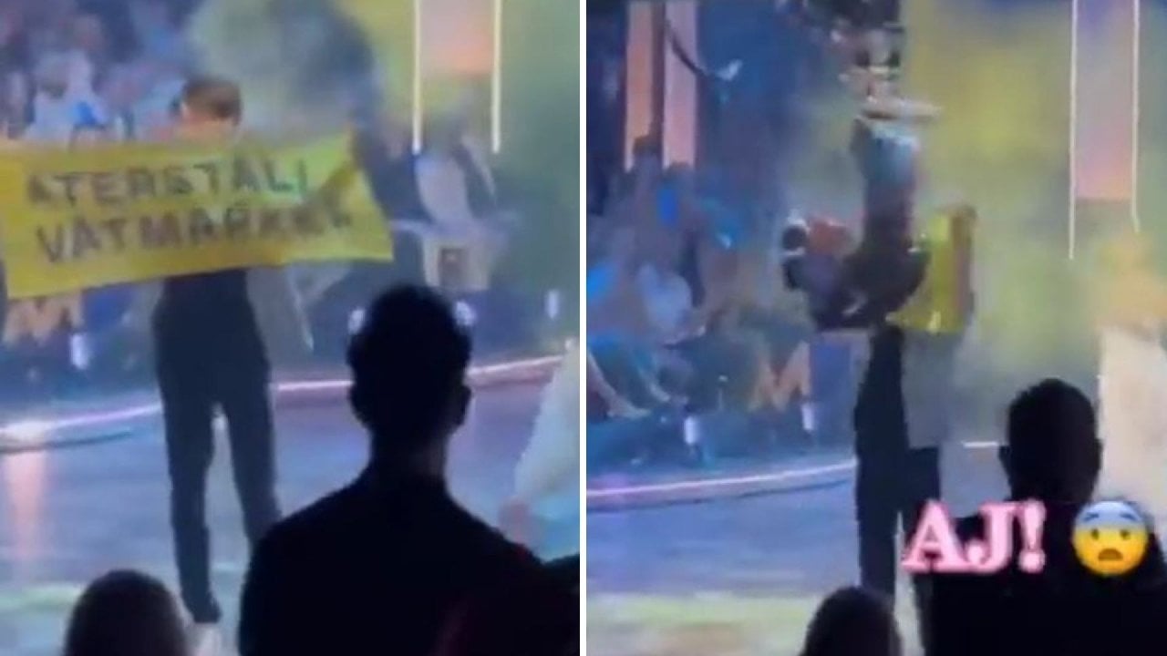 Sosyal medyada paylaşılan manzaralarda, sahnede performans sergileyen dansçıların ortasına dalan 2 iklim aktivisti, pankart açıp, ellerindeki renkli tozları havaya attı.
