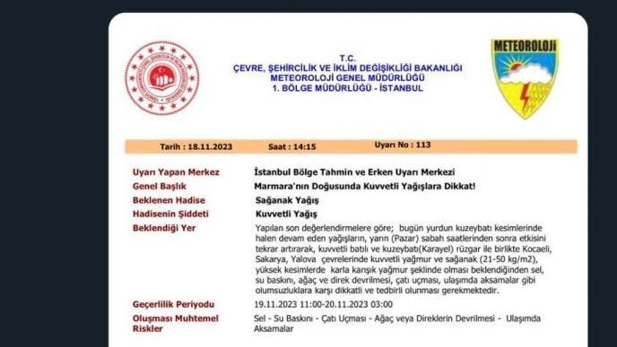Sakarya Valiliği, meteorolojik bilgilere nazaran 19 Kasım Pazar günü sabah saatlerinden itibaren tesirini artıracak sağanak yağışa karşı toplumsal medya hesabından ihtarlarda bulundu. Valilik tarafından yapılan paylaşımda, “Yapılan son değerlendirmelere nazaran; bugün yurdun kuzeybatı bölümlerinde hala devam eden yağışların, yarın (Pazar) sabah saatlerinden sonra tesirini tekrar artırarak, kuvvetli batılı ve kuzeybatı (Karayel) rüzgarı ile birlikte Kocaeli, Sakarya, Yalova etraflarında kuvvetli yağmur ve sağanak (21-50 kg/m2), yüksek kısımlarda karla karışık yağmur biçiminde olması beklendiğinden sel, su baskını, ağaç ve direk devrilmesi, çatı uçması, ulaşımda aksamalar üzere aksiliklere karşı dikkatli ve önlemli olunması gerekmektedir” denildi.