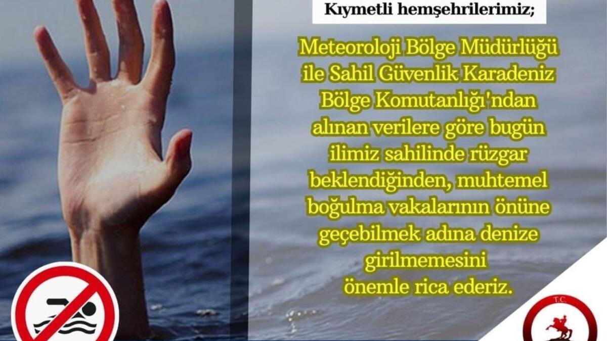 Bugün yapılan ihtarda ise “Kıymetli hemşehrilerimiz; Meteoroloji Bölge Müdürlüğü ile Kıyı Güvenlik Karadeniz Bölge Komutanlığı’ndan alınan bilgilere nazaran bugün ilimiz kıyısında rüzgar beklendiğinden, mümkün boğulma hadiselerinin önüne geçebilmek ismine denize girilmemesini ehemmiyetle rica ederiz” denildi.