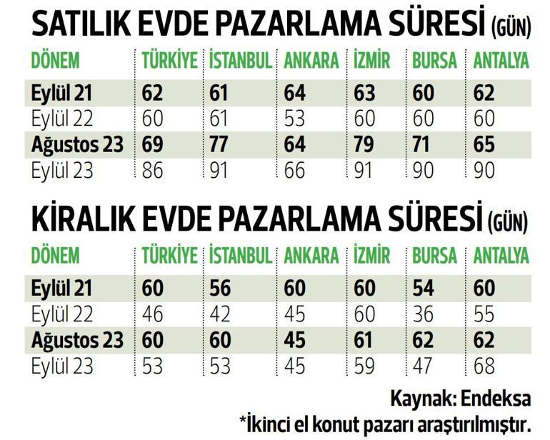 Satılık konutta pazarlama mühletinin uzadığını, kiralıkta ise kısaldığını belirten Endeksa Kurucu Ortağı ve Genel Müdürü Görkem Öğüt, şunları söyledi: “Tüm Türkiye’de satılmayı bekleyen, 4 yaş üzeri 2. el gayrimenkullere baktığımızda eylül ayında pazarlama müddeti 86 güne çıkmış durumda. Geçen yıl bu sayı 60’dı. Kiralık adetleri eylülde okulların açılıyor olması ve mesken sahibinin bu devri beklemiş olması nedeniyle adet olarak artmış olsa da kiralık gayrimenkullerin ortalama ilan müddeti 53 güne düştü. Bu bize kiraya vereceklerin olağandan daha kısa müddette kiracı bulduğunu, lakin satıcıların alıcı bulmakta zorluk çektiğini gösteriyor.”