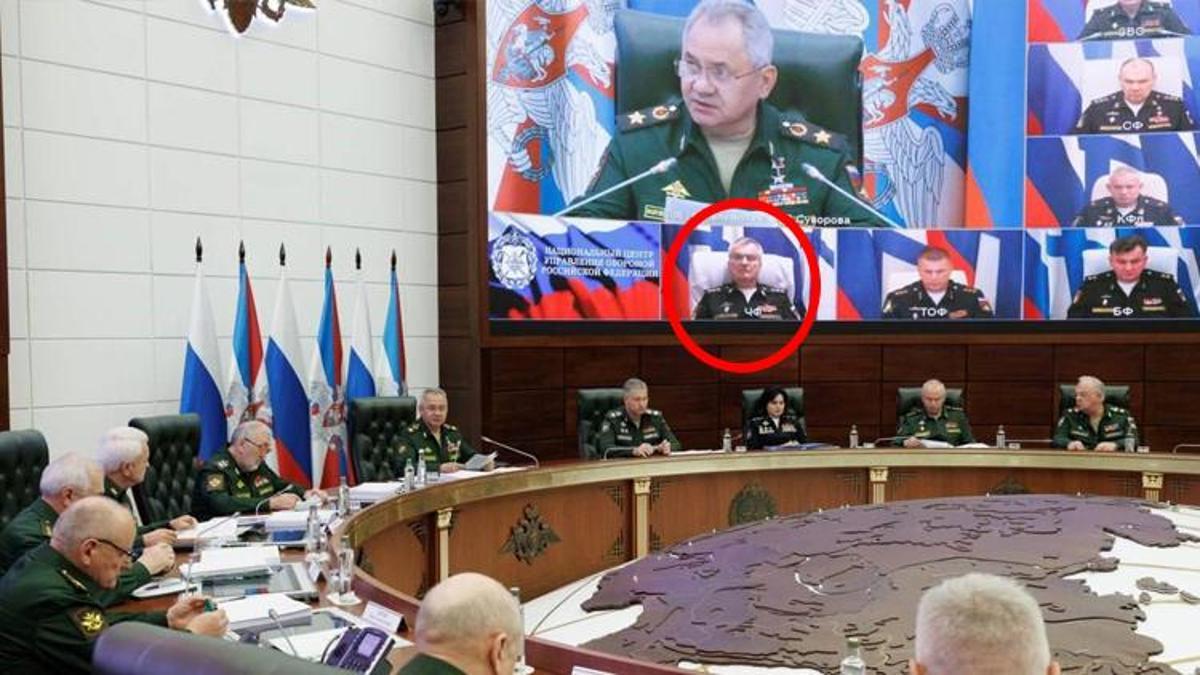 Sokolov görüntüde, Rusya Savunma Bakanı Sergey Şoygu ile başka kimi üst seviye amiraller ve ordu kumandanlarıyla bir görüntü konferansta görülüyor.