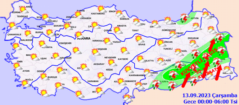 Parçalı ve çok bulutlu, doğu kesitlerinin mahallî olmak üzere sağanak ve gök gürültülü sağanak yağışlı geçeceği kestirim ediliyor. Yağışların; Van ve Bitlis etraflarında yer yer kuvvetli olması bekleniyor. Rüzgarın; güneydoğusunda güney ve güneybatı istikametlerden kuvvetli (50-70 km/saat) olarak eseceği kestirim ediliyor.