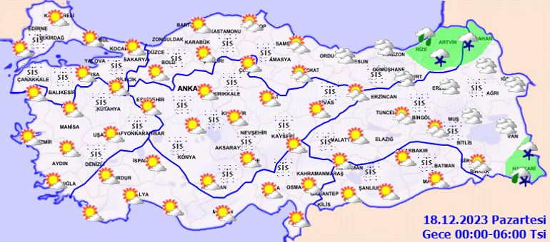 Meteoroloji Genel Müdürlüğü tarafından yapılan son değerlendirmelere nazaran, ülkemizin kuzeydoğu kısımlarının modüllü ve çok bulutlu, bu akşam saatlerinde Orta Karadeniz kıyıları, Doğu Karadeniz, Doğu Anadolu’nun doğusu ile Siirt ve Sinop etraflarının yağışlı geçeceği varsayım ediliyor. Yağışların Orta ve Doğu Karadeniz kıyıları, Siirt, Sinop, Van ve Iğdır etraflarında yağmur, yağış alan başka yerlerde karla karışık yağmur ve kar halinde olması bekleniyor. Bu gece ve yarın (Pazartesi) sabah saatlerinde Marmara ile iç ve doğu bölümlerde yer yer sis ve pus hadisesinin görüleceği iddia ediliyor.