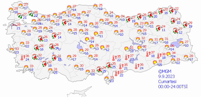 Parçalı ve az bulutlu, Batı Akdeniz’in iç bölümleri, Orta ve Doğu Akdeniz (Hatay hariç) aralıklı sağanak ve gök gürültülü sağanak yağışlı geçeceği iddia ediliyor. Yağışların öğlen saatlerinden sonra Adana, Osmaniye etrafları, Mersin’in kuzeyi, Kahramanmaraş’ın Andırın ilçesi ile Hatay’ın kuzeyinde mahallî olarak kuvvetli yer yer çok kuvvetli ve şiddetli olması bekleniyor.