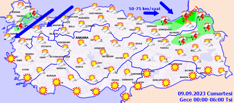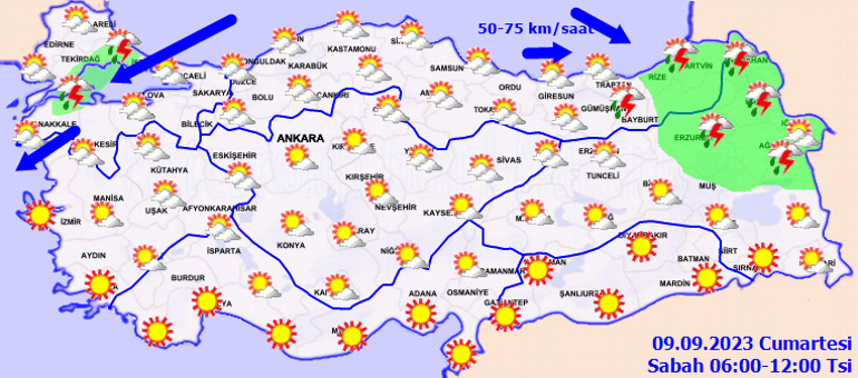 Meteoroloji Genel Müdürlüğü tarafından yapılan son değerlendirmelere nazaran, ülkemizin kuzey, iç ve batı bölümlerinin kesimli ve yer yer çok bulutlu, İç Ege, Batı Akdeniz’in iç kısımları, Orta ve Doğu Akdeniz (Hatay hariç), Doğu Karadeniz kıyıları, Doğu Anadolu’nun Kuzeydoğusu ve İstanbul, Kırklareli, Eskişehir ve Bolu etrafları ile Ankara’nın batı ilçelerinin lokal sağanak ve gök gürültülü sağanak yağışlı, öteki yerlerin az bulutlu ve açık geçeceği kestirim ediliyor. Yağışların Rize etrafları ile Artvin’in kuzeyinde, yarın öğlen saatlerinden sonra Afyonkarahisar, Uşak, Denizli, Adana, Osmaniye, Mersin’in kuzeyi, Kahramanmaraş’ın Andırın ilçesi ile Hatay’ın kuzeyinde, Ağrı etrafları, Van’ın kuzey kesitleri ve Iğdır’ın güney kesitlerinde mahallî olarak kuvvetli yer yer çok kuvvetli ve şiddetli olması bekleniyor.