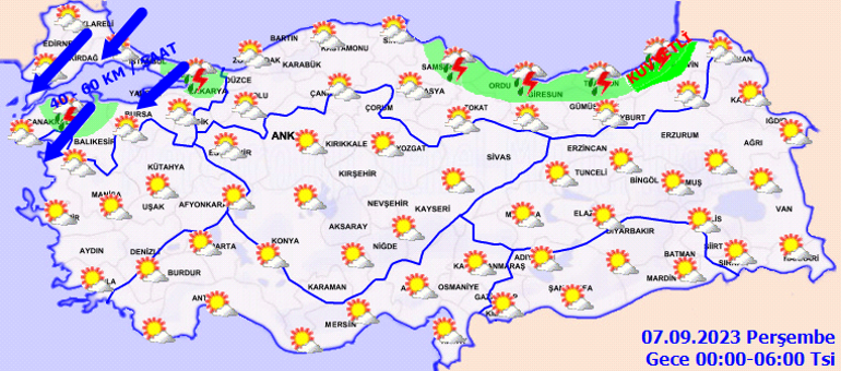 Öte yandan perşembe akşam saatlerine kadar Trabzon’un doğusu, Rize vilayet geneli ve Artvin’in kıyı ilçelerinde lokal kuvvetli gök gürültülü sağanak yağış bekleniyor. Ani sel, su baskını, yıldırım, heyelan, mahallî dolu yağışı, ani kuvvetli rüzgar ve kısa periyodik fırtına ile ulaşımda aksamalar üzere aksiliklere karşı dikkatli ve önlemli olunmalıdır.