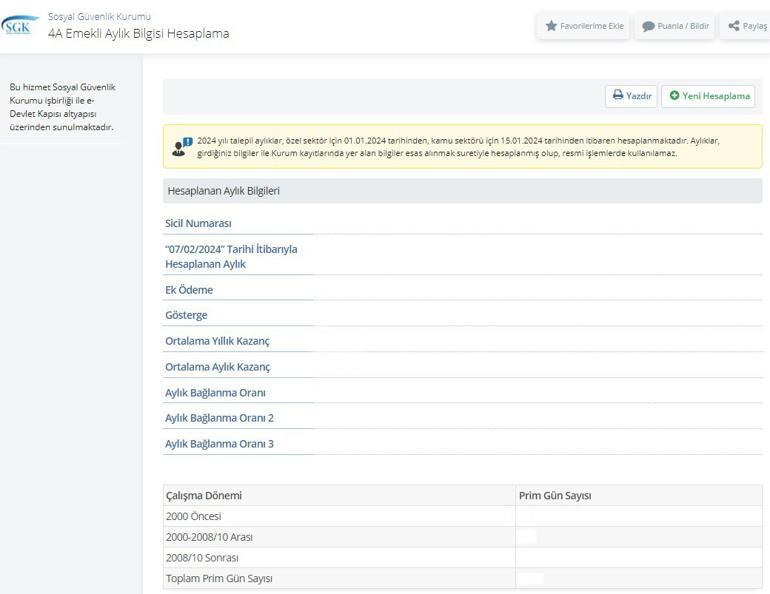 Son gelen pencerede mümkün emekli maaşı, ek ödeme meblağı, aylık ve yıllık ortalama çıkarlar, devirlere nazaran aylık bağlanma oranları ve yeniden devirlere prim gün sayılarınız ortaya çıkıyor.