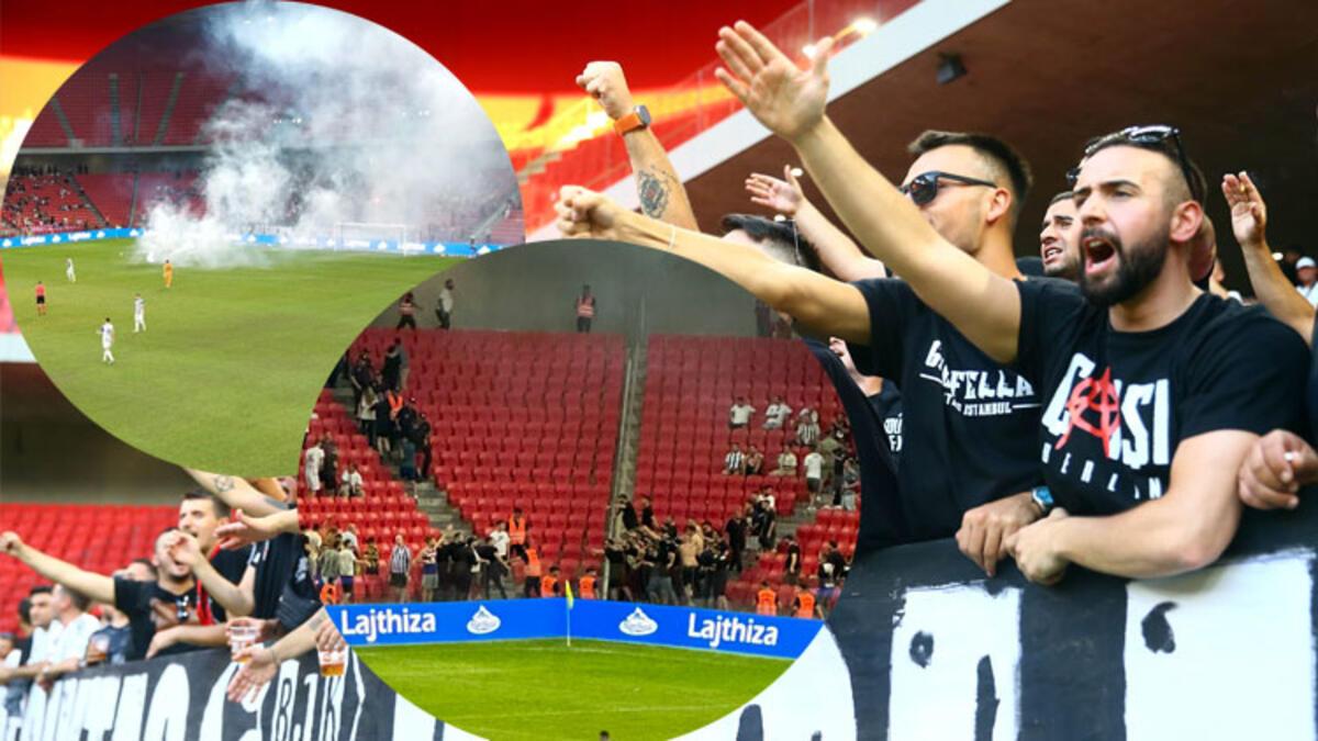 İki kadro, santra için hazırken Beşiktaş tribünlerinde yakılan meşalelerin bir kısmı alana atıldı. Bunun üzerine hakem anons yapılmasını istedi. Anons yapılırken iki kadro taraftarları ortasında arbede çıktı. Taraflar birbirlerine yabancı unsur attılar.