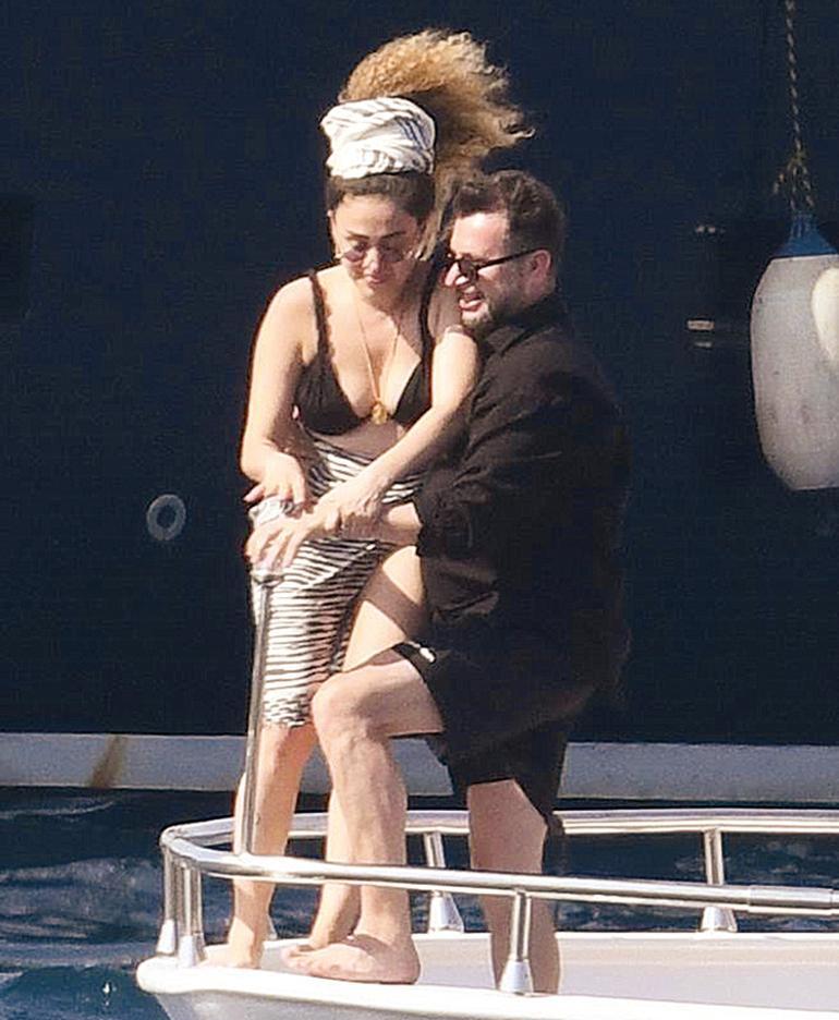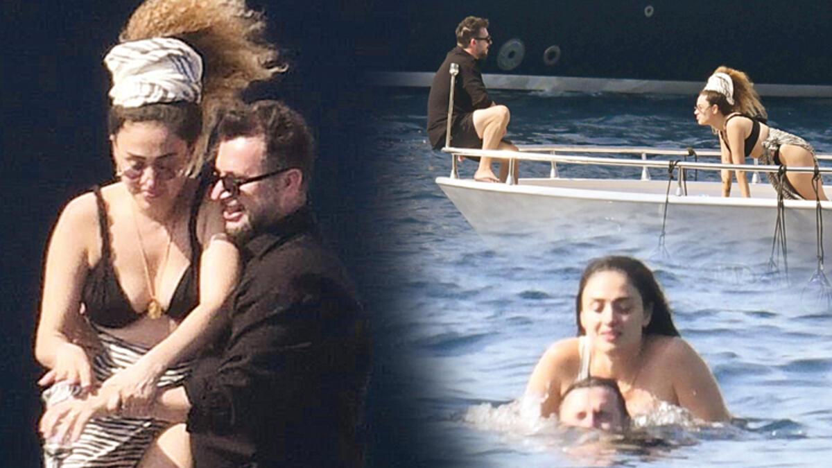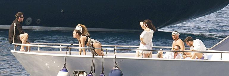 Teknenin uç kısmında birbirine sarılan çiftin bu manzarası akıllara “Titanik” sinemasının meşhur sahnesini getirdi. İki ünlü isim daha sonra arkadaşlarıyla bir arada denize girip serinledi. (Umut ÜNVER)