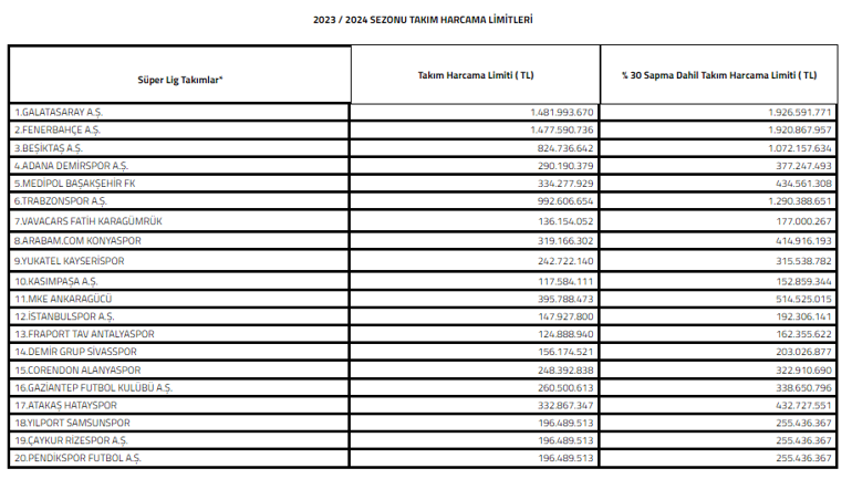 Türkiye Futbol Federasyonu Kulüp Lisans Konseyi, 22 Haziran 2023 tarihli toplantısında 2023-2024 Dönemi Harika Lig Grup Harcama Limitleri’ni belirledi.
