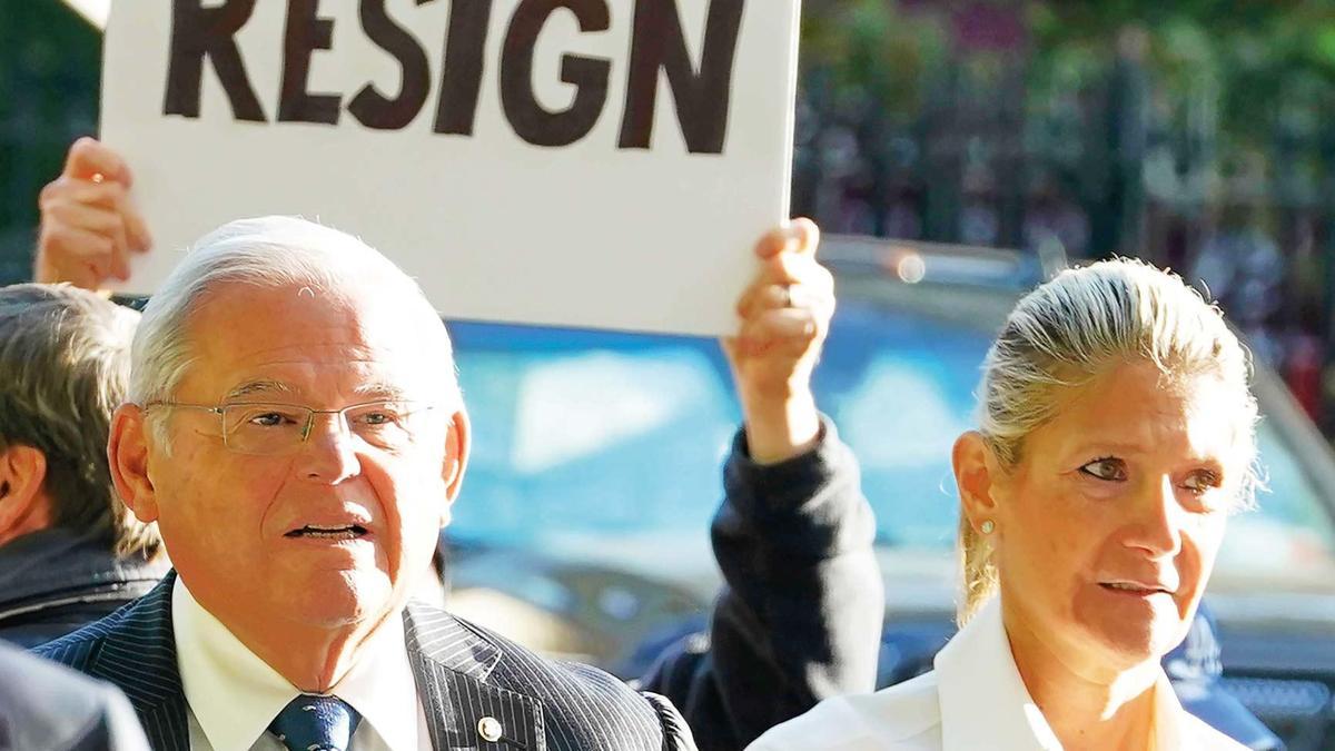 Bob Menendez ve eşi Nadine Arslanian’ın mahkemeye gelişi sırasında bir vatandaş ‘İstifa’ diye pankart açtı.