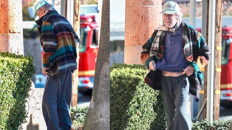 Üzerinde yıpranmış bir eşofman altı ve üzerinde kareli gömleğiyle görüntülenen ünlü oyuncunun ayağında da terlikleri vardı…