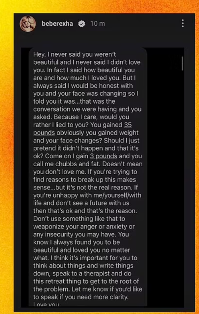 2020’de, koronavis pandemisi sırasında karantinaya da birlikte girdiği sevgilisiyle üç yıldır daima aşk pozları veren Bebe Rexha, konserde gözyaşı döküp hayranlarını üzdükten sonra bu beklenmedik ayrılıkla ilgili sır perdesini de araladı. Bebe Rexha, ayrılığa sebep olan, sevgilisinin ona yolladığı bildirisi Instagram sayfasından paylaşarak yaşananların milyonlar tarafından öğrenilmesini sağladı. Bebe Rexha, internet üzerinden ona kiloları yüzünden saldıran ve dalga geçen bireyler üzere erkek arkadaşı tarafından da misal bir muamele görmüştü.